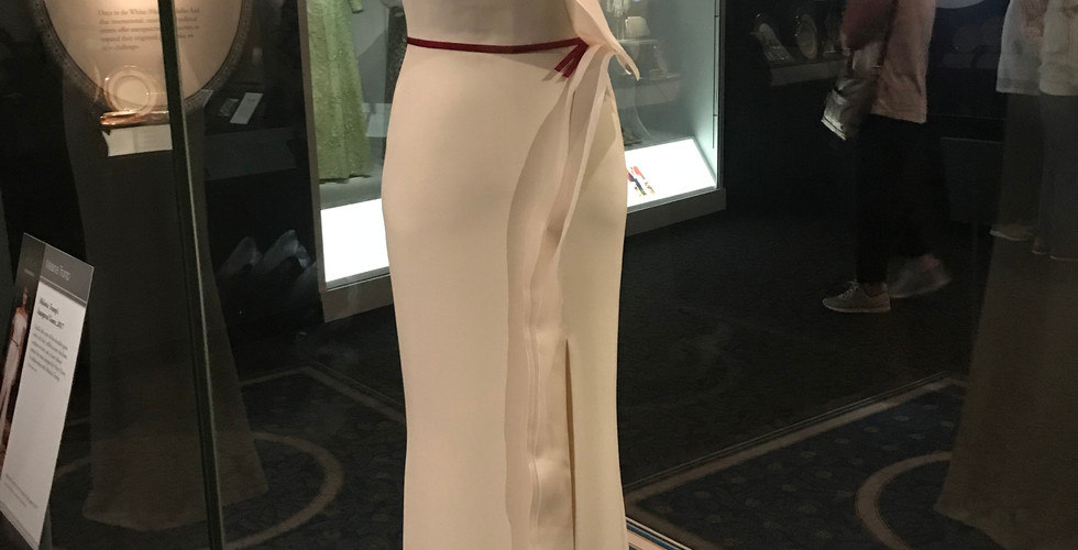 First Lady Melania Trump donated her inaugural gown, as is tradition for first ladies to do. But dare I say it, it was the most beautiful gown in the entire exhibit. (in my opinion). I just love the simplicity of the color and design that makes this dress modestly classy. I love off-the-shoulder dresses and this reminds me of something a greek goddess would wear.